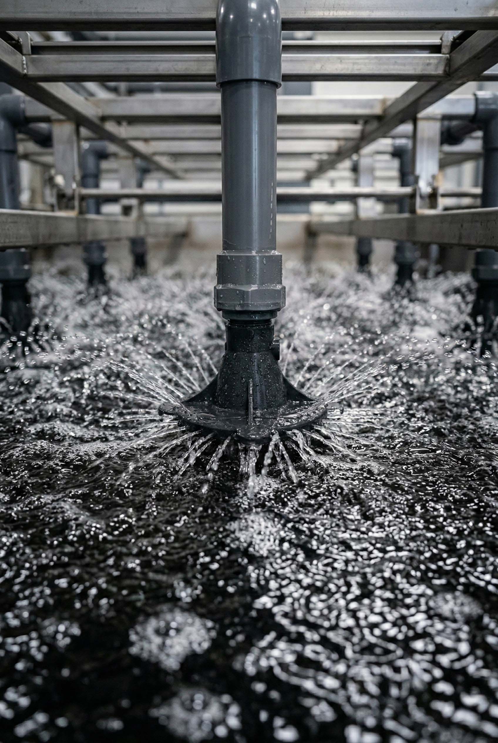 Sistema aeróbico que utiliza módulos plásticos de alta superficie donde se desarrolla un biofilm que degrada la materia orgánica. Distribución uniforme mediante rociado para máxima eficiencia.