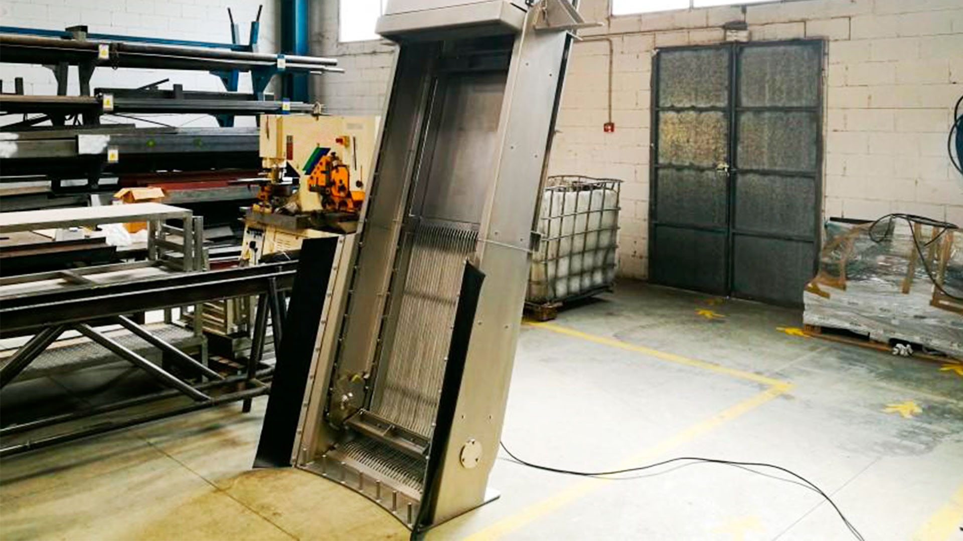 Esta Canastilla se desliza por medio de cuatro rodamientos hecho en acero inoxidable AISI 316 y se eleva por medio de un cable de acero inoxidable por medio de grilletes instalados en la parte superior. Los desperdicios que trae el agua servida se depositan en la parte inferior de la canastilla.